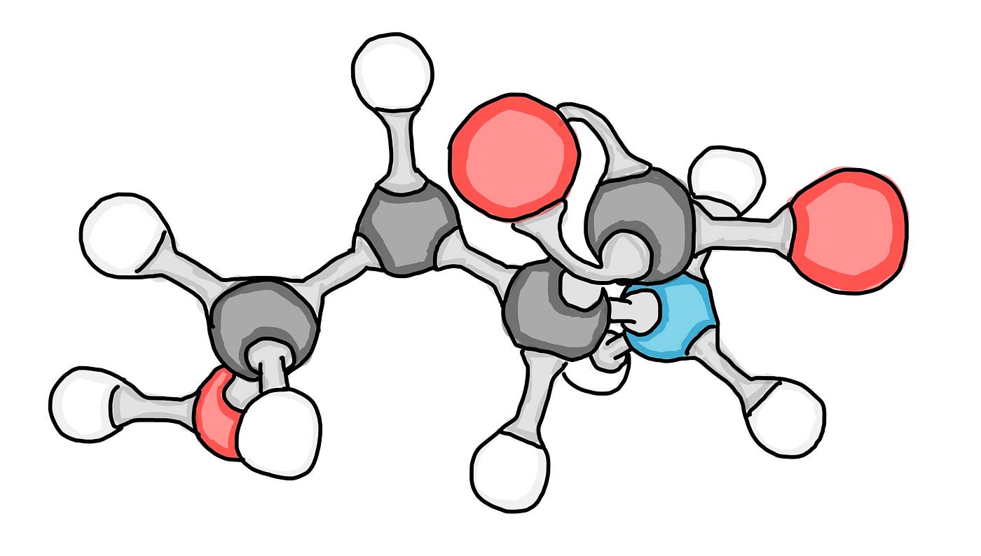 Cartoon illustration of a molecular model. Red, blue, dark gray and white represents oxygen, nitrogen, carbon and hydrogen atoms while the light gray connecting the atoms are the bonds. Each atoms can be comparable to a Lego block. The constructed molecule shown above is comparable to a constructed Lego entity (such as the yellow house shown above in this article). (Drawn by Chanin Nantasenamat)